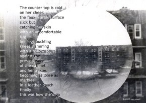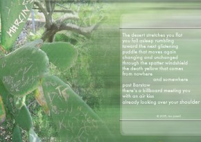 Sharon Brogan created this poetry postcard. She writes, “I suppose you could call this a collaboration among the snapshotting me, the messing around with digital art me, and the poet me.”